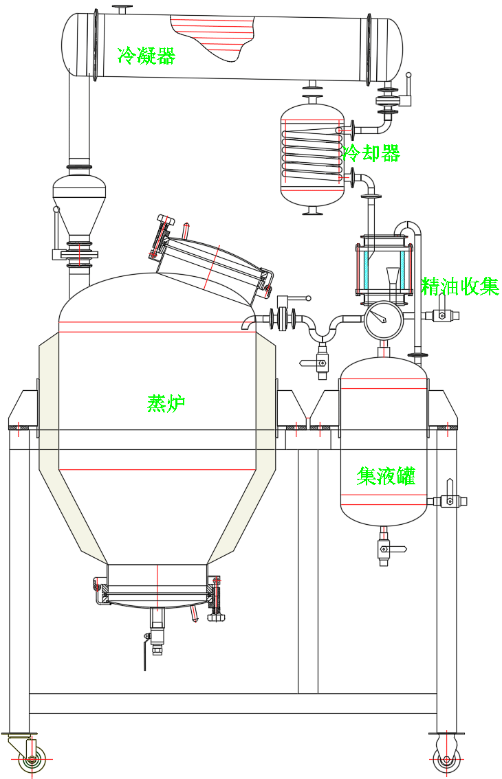 工藝流程:開啟加水,可隔水蒸餾,也可共水蒸餾,開電加熱或蒸汽,水沸騰產(chǎn)生蒸汽,蒸汽透過提取機內(nèi)物料,隨及將精油純露析出,精油純露蒸汽沿排汽管上