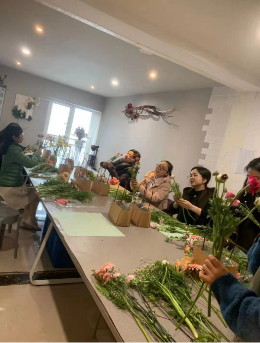 當小伙伴們看到桌子上鋪滿的各類花材,都迫不及待、躍躍欲試。大家一邊認真聽取花藝老師的講解,一邊對自己手中的花材進行修剪、搭配、造型,期間互相交流,忙得不亦樂乎